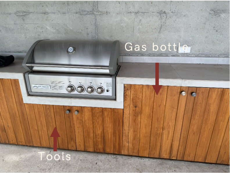 You can use the BBQ in the outdoor kitchen. The gas bottle is behind the door to the right of the BBQ. To turn on the gas, please move the black lever towards the tube side of the valve.