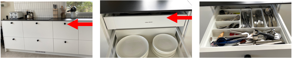 You can find the cutlery in an inside drawer in the 3rd cupboard from the left
