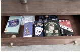 There are some games in the drawer of the wooden bureau in the Living Room.